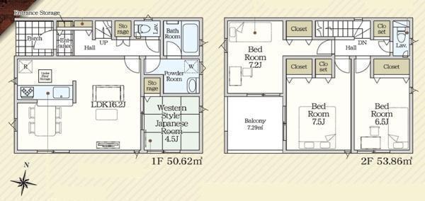 1階は広々としたLDKに加え和室も備わっています。2階には3つの洋室がそれぞれクローゼット付きで配置されています。1階・2階とも収納スペースが充実していて使い勝手の良い間取りです。