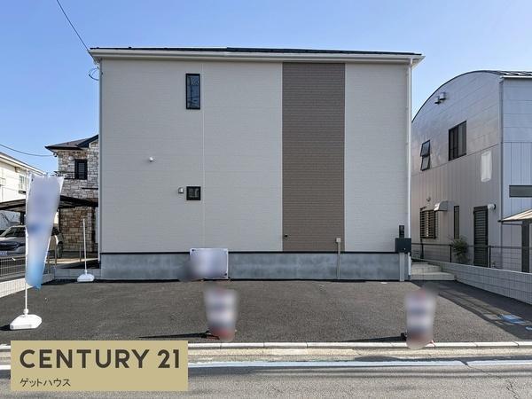 シンプルなデザインが引き立つ外観です。敷地前にはゆとりのあるスペースが確保されています。道路に面しているため車の出入りもスムーズです。周囲は落ち着いた雰囲気の環境です。