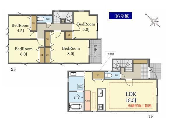 1F LDK 18.5帖 、2F 洋 8.0帖 、2F 洋 6.0帖 、2F 洋 5.0帖 、2F 和 4.5帖