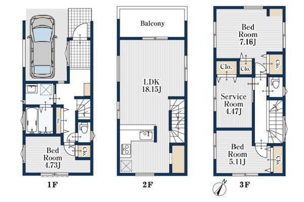 1F 洋 4.7帖 、2F LDK 18.1帖 、3F 洋 7.1帖 、3F 洋 5.1帖 、3F S(納戸) 4.4帖