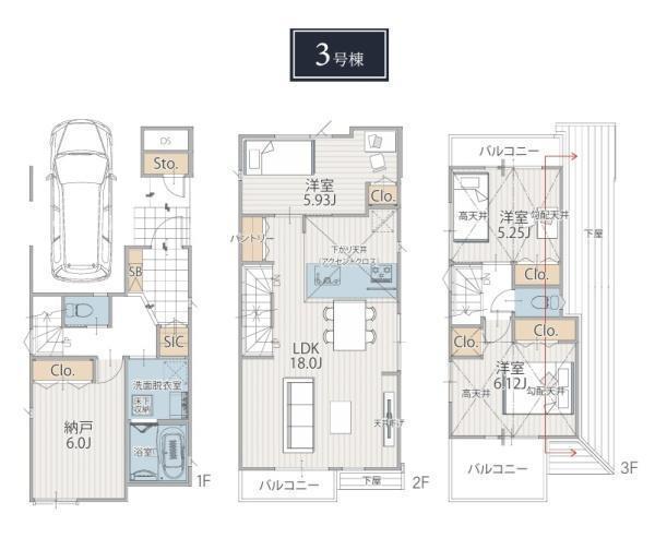 1F S(納戸) 6.0帖 、2F LDK 18.0帖 、2F 洋 5.9帖 、3F 洋 6.1帖 、3F 洋 5.2帖