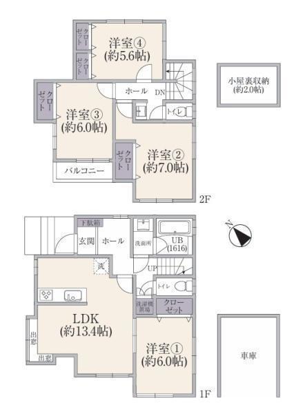 1F LDK 13.4帖 、1F 洋 6.0帖 、2F 洋 7.0帖 、2F 洋 6.0帖 、2F 洋 5.6帖