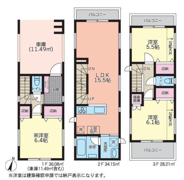 1F S(納戸) 6.4帖 、2F LDK 15.5帖 、3F 洋 6.1帖 、3F 洋 5.5帖