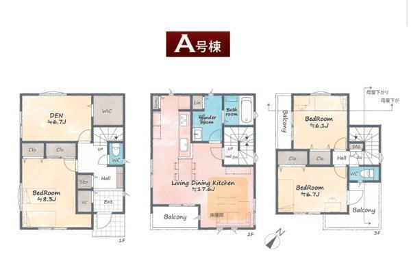 1F 洋 8.3帖 、1F S(納戸) 6.7帖 、2F LDK 17.6帖 、3F 洋 6.7帖 、3F 洋 6.1帖